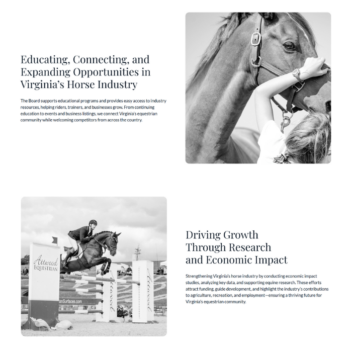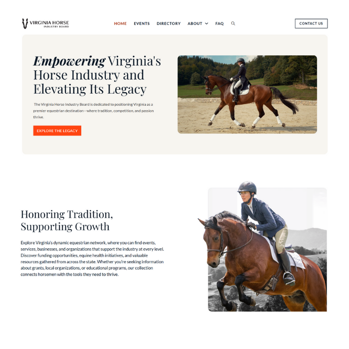 The Virginia Horse Industry Board connects and supports Virginia’s equine community through education, outreach, and resources. We built a brand new website from the ground up, making it easy for members of the community to post events, discover upcoming activities, and connect with local services through an interactive directory. The site also serves as a hub for board news, grant info, and resources about Virginia’s thriving horse industry. From design to launch, every element was crafted to make the site inviting, user-friendly, and a true asset for Virginia horse enthusiasts.